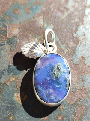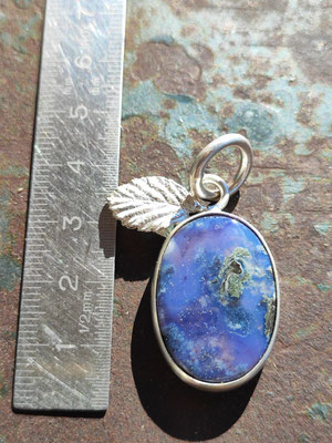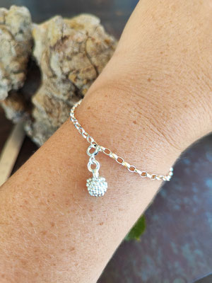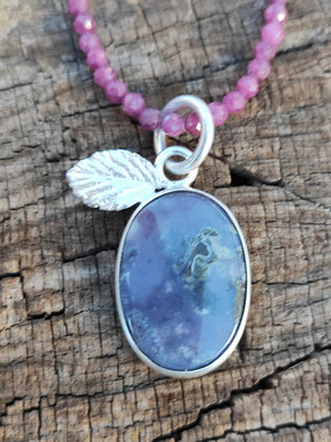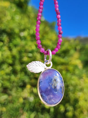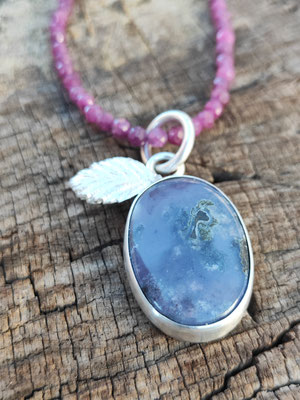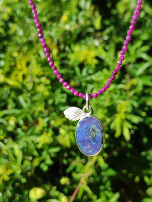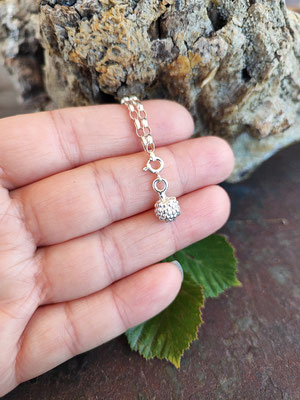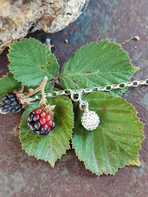 Brombeere und Blatt bilden eine sehr schöne Kombination. Der Zierdraht aus feinen Kügelchen rundet den Anhänger mit der passenden Kugelöse ab.
