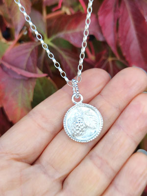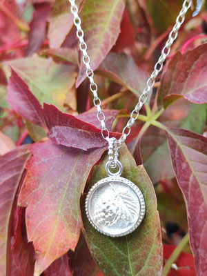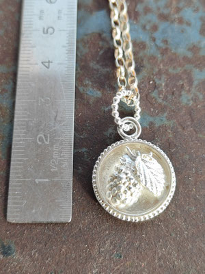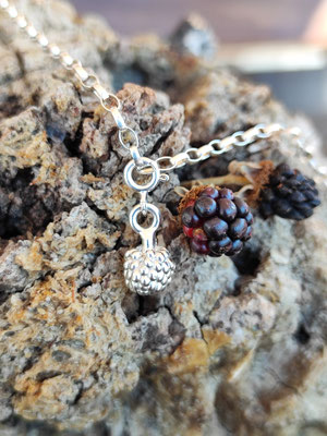 Diese Brombbere wurde von mir in Silber gegossen und per Hand zu diesem schönen Schmuckstück verarbeitet. Für diese Technik verwende ich immer wieder neue Beeren, somit ist jeder Anhänger ein kleines Unikat und kann ein wenig vom Foto abweichen.